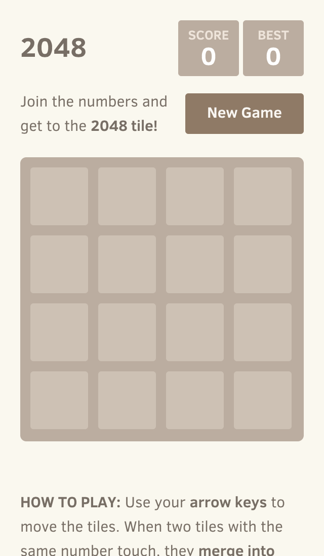 New GameHow to play: Use your arrow keys (or swipe on mobile) to move the tiles. When two tiles with the same number touch, they merge into one!